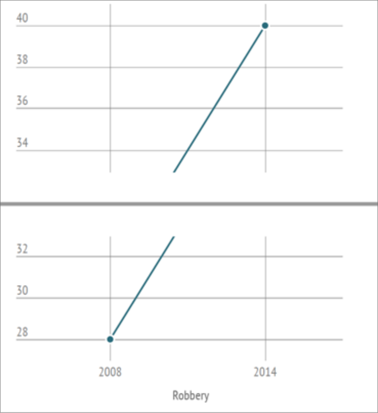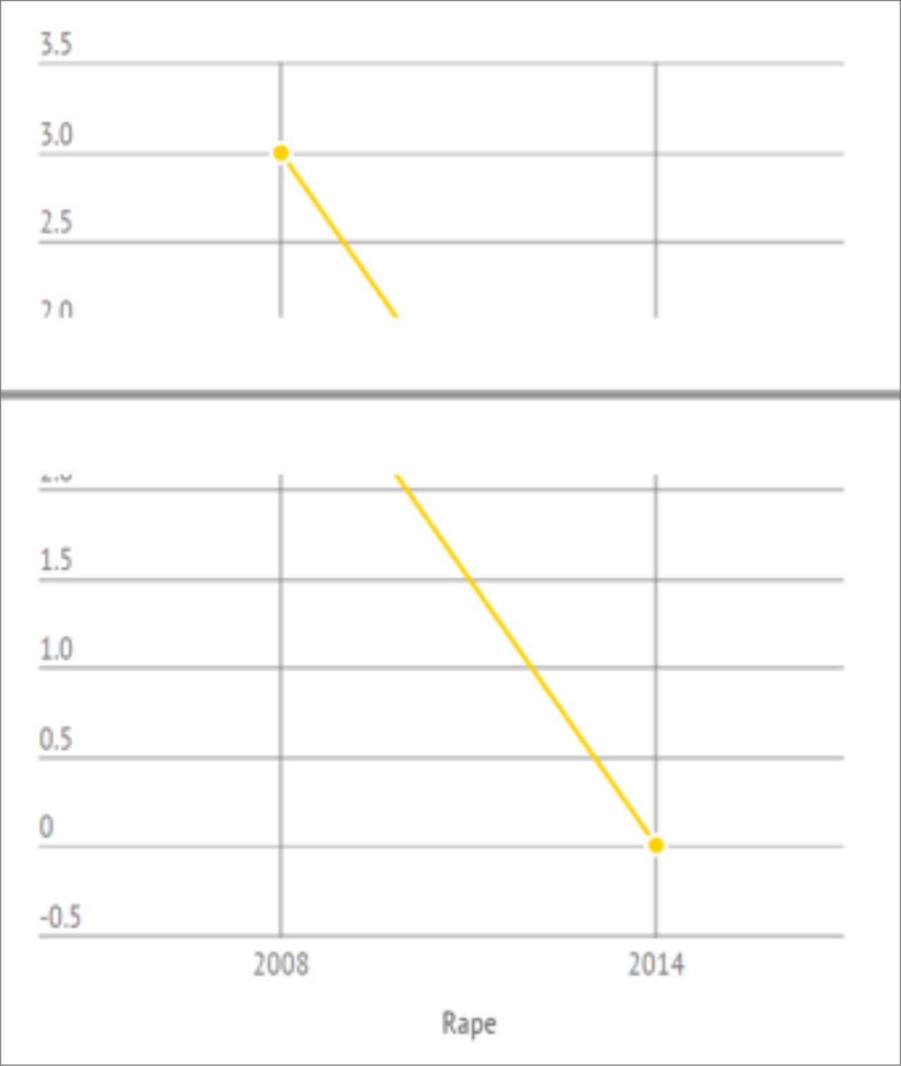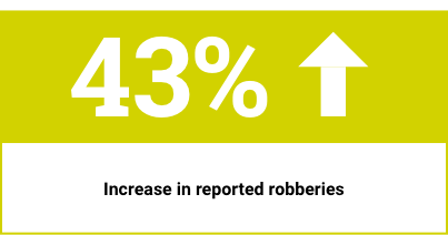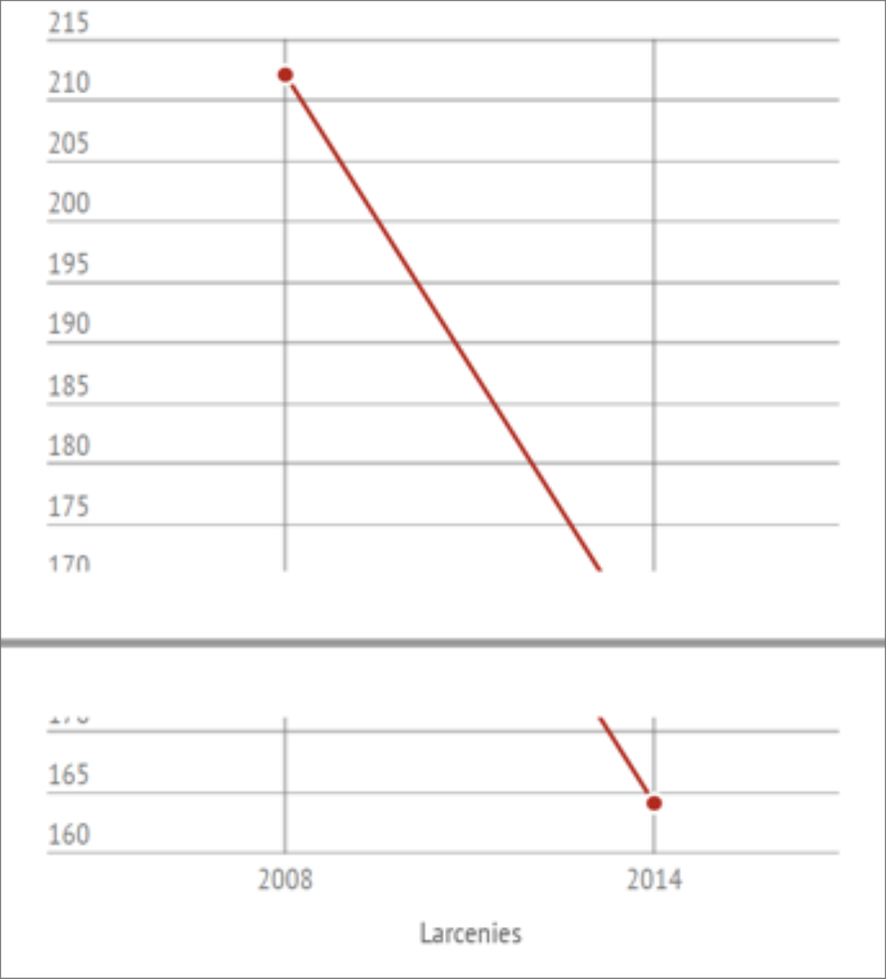 There was an increase in reported crimes in two areas: robbery and stolen motor vehicles. Robberies increased by 43 percent, with 40 reported. Three dozen vehicles were reported stolen in 2014, an increase of one when compared to 2008. Three rapes were reported seven years ago while none were in 2014. No murders were committed in the area either year.