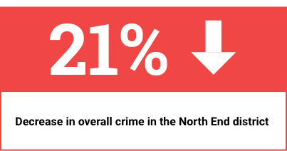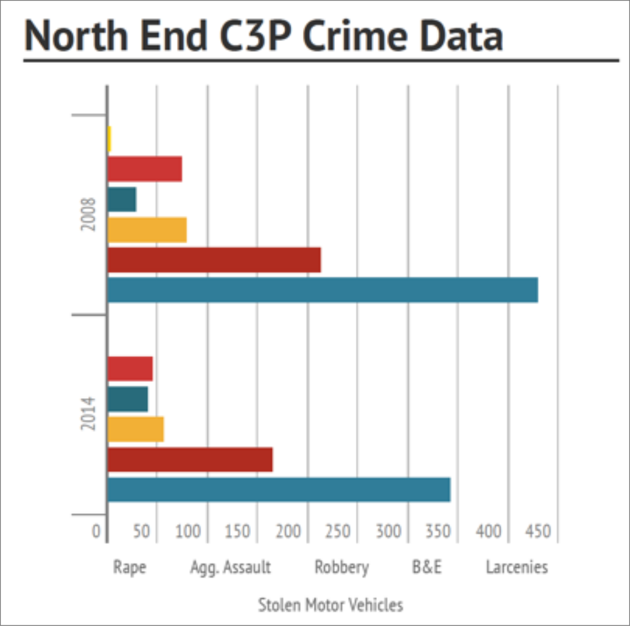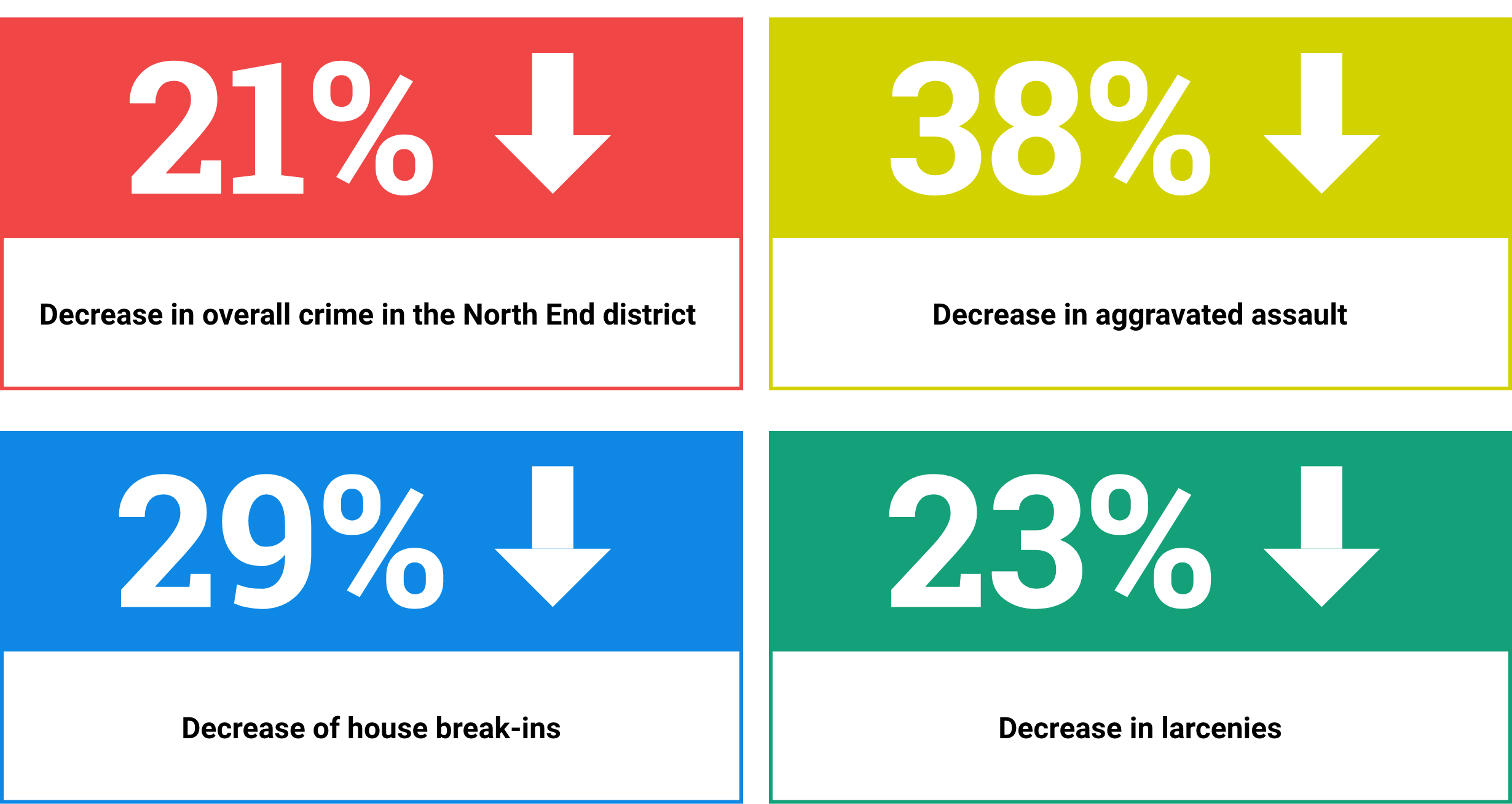 In a neighborhood where drug dealers were once seen riding motorcycles while carrying semi-automatic rifles, police report progress. Crime is down 21 percent in the North End district, com-paring 2008 to 2014 statistics. The largest drop was in aggravated assault, with 28 fewer report-ed — a 38 percent decrease. There has also been a decrease in larcenies, breaking and enter-ing. The number of house break-ins dropped from 79 to 56 – a 29 percent decrease – and larce-nies fell 23 percent, from 212 to 164.