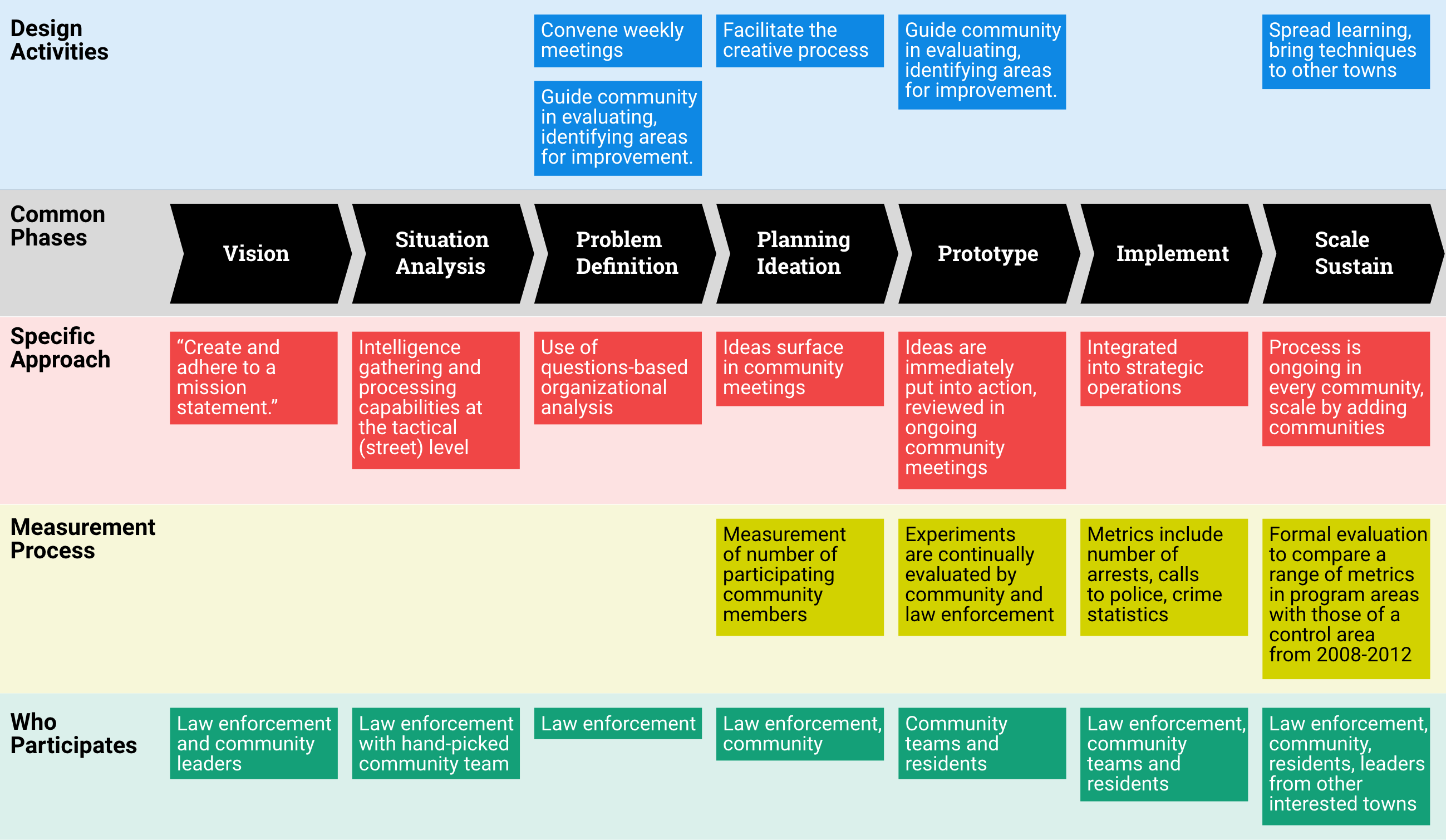 Counter Criminal Continuum (C3), draws on strategies used in US military campaigns against insurgents in Iraq and Afghanistan. State Trooper Mike Cutone and Thomas Sarrouf were Army Green Berets, trained in counter-insurgency strategies on multiple tours of duty. Home in Spring-field, Massachusetts, they realized gang members and criminals act similarly to insurgents: inserting themselves into poverty-stricken neighborhoods where they thrive on the passive support of intimidated communities. Now a handful of troopers and dozens of local community leaders apply C3 strategies — essentially the social design process — with a dramatic reduction in crime and violence.