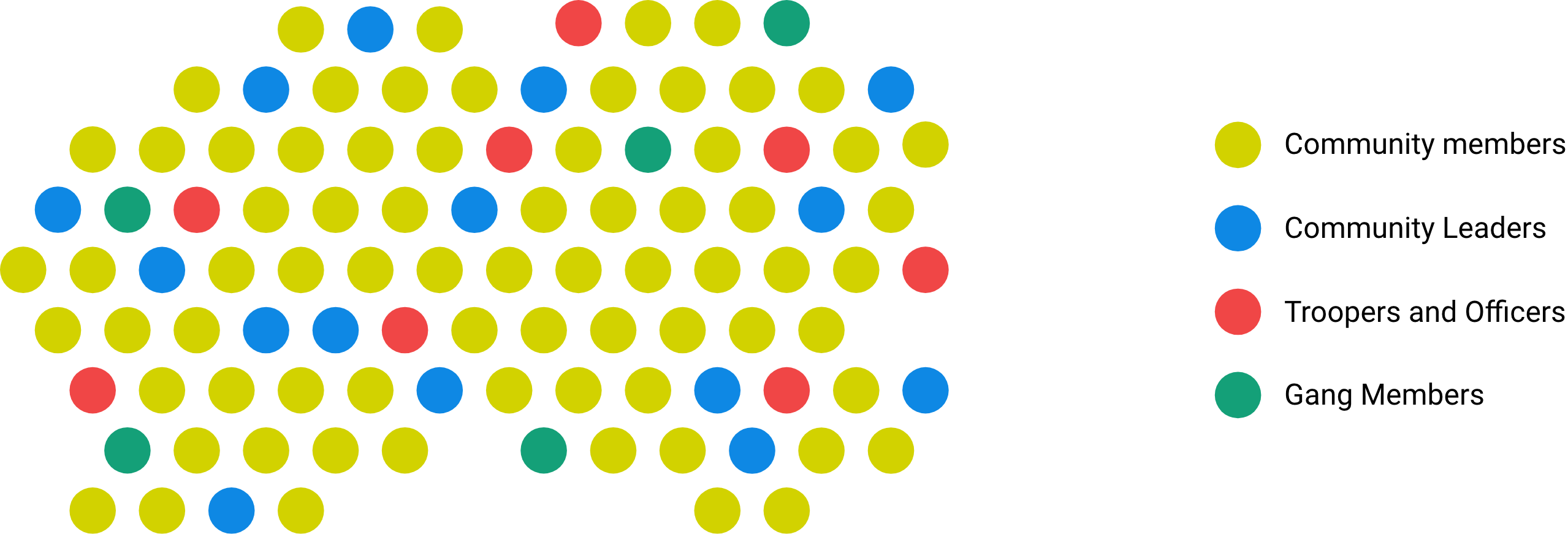 The team working on the project now includes a lieutenant, Michael Domnarski, also a veteran, and several other troopers. There are no external design consultants, rather this process is em-bedded into the work that troopers and local leaders conduct on the ground. When additional of-ficers are needed, they require dedicated time for building relationships and trust.