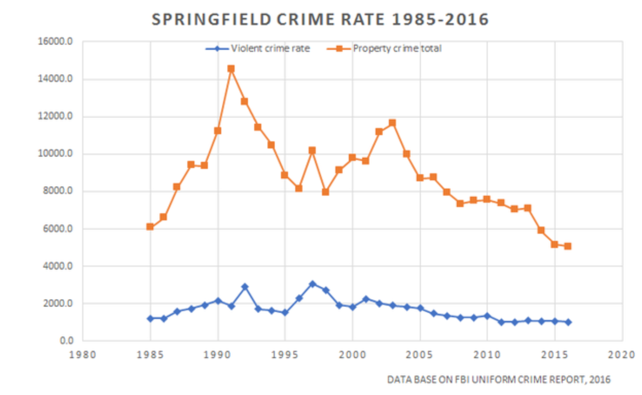 More recent data from FBI aggregated crime reports show substantial decline in both violent and property crime in Springfield from 1985 to 2016. From 2012 to 2016, crime statistics show a 45 percent decline, which city officials said is due to a “combined effort of pro-active policing and community involvement.”(cite article) In 2013, the total number was 11,348. In addition, the data show an increase in 911 calls representing increased involvement by the community to report and combat crime. City officials cited the C-3 policing program where officers meet regularly with neighborhood residents, businesses and community leaders to share information and focus on preventing crime, and the community beat management teams throughout the city. They are our eyes and ears. Without them, very little gets done.