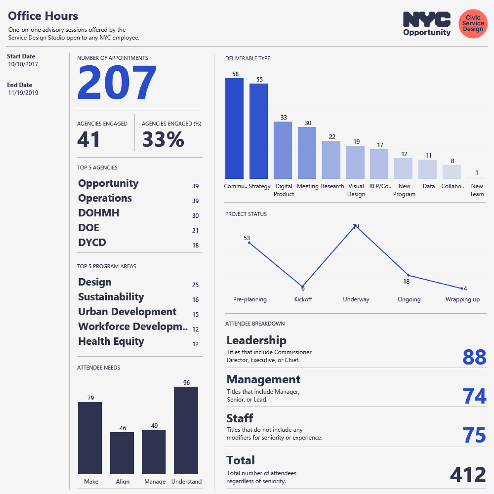 As part of the Mayor’s Office, the Studio is in a unique position to work with public servants from the 100+ agencies that comprise the City of New York. As a small team, the Studio offers a number of different ways for public servants to engage with them.